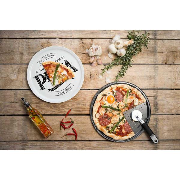Maak elke pizzanight compleet met dit stijlvolle pizzabord! Het bord heeft een strak design met een vrolijk receptdecor, ideaal om je favoriete pizza in stijl te serveren. Met een royale diameter van 30 cm is er voldoende ruimte voor een hele pizza. Daarnaast is het bord afwasmachinebestendig, wat zorgt voor makkelijk schoonmaken na het genieten. Perfect voor pizzaliefhebbers en een leuke aanvulling op je tafel!