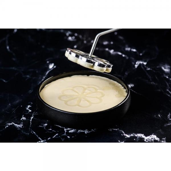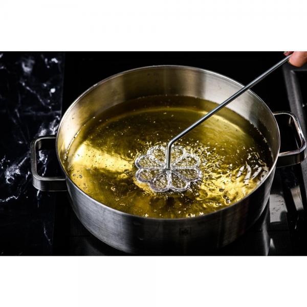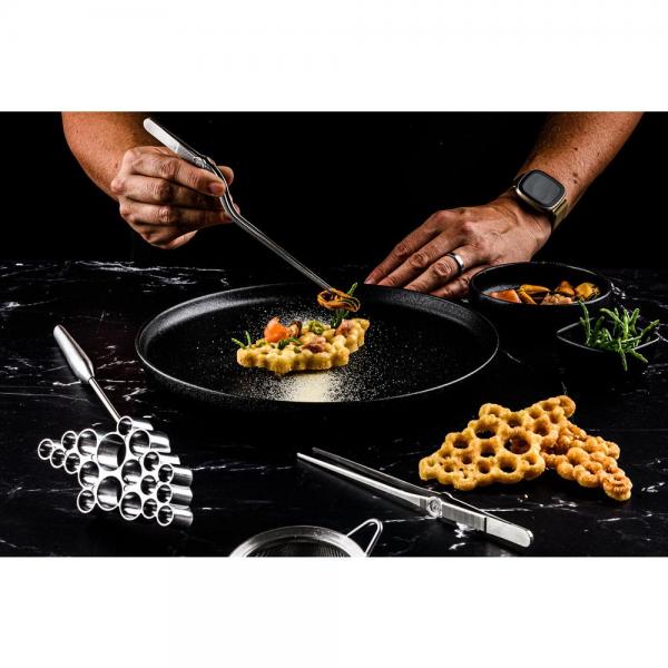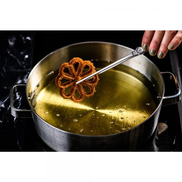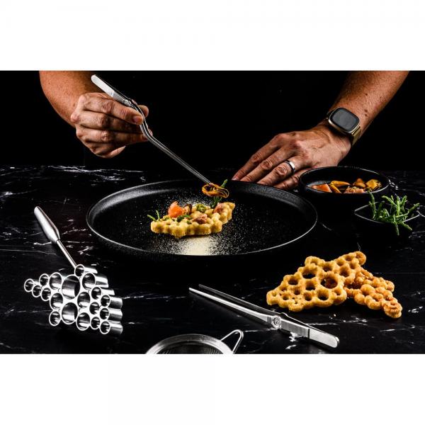 Met de Buñuelos Rosette van Plate-it maak je de typisch Spaanse mini-beignets in een sierlijke bloemvorm. Een prachtig onderdeel van een opgemaakt dessert, of, met een minder zoet beslag, als basis voor een indrukwekkend hoofdgerecht.