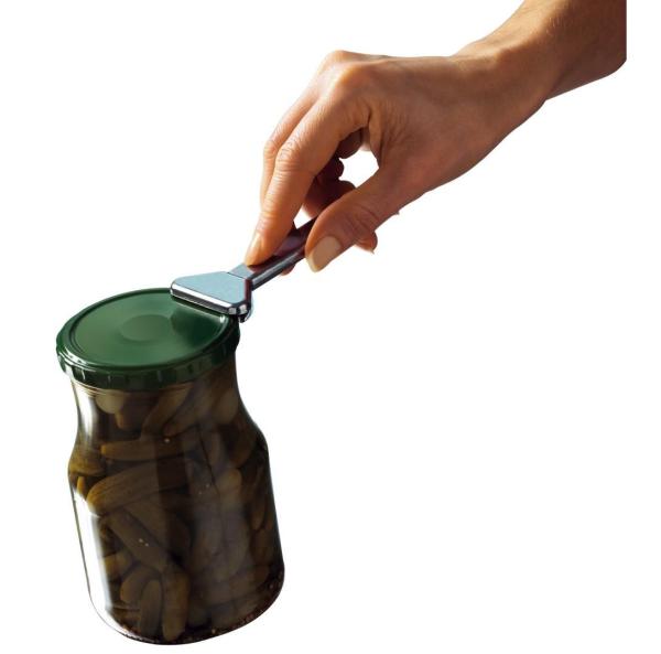 Deze potopener JarKey van Brix opent vacuüm deksels in een handomdraai: plaats de JarKey tegen het deksel en met een lichte beweging wordt het vacuüm verbroken en kan de pot moeiteloos worden opengedraaid. Uniek aan de JarKey is het speciale drie-punten principe dat ervoor zorgt dat het deksel met een zachte klik wordt geopend zonder het deksel te beschadigen. De JarKey is gemaakt van aluminium, en heeft geen scherpe randen, punten of beweegbare delen. De JarKey is gepatenteerd en vaatwasmachinebestendig.