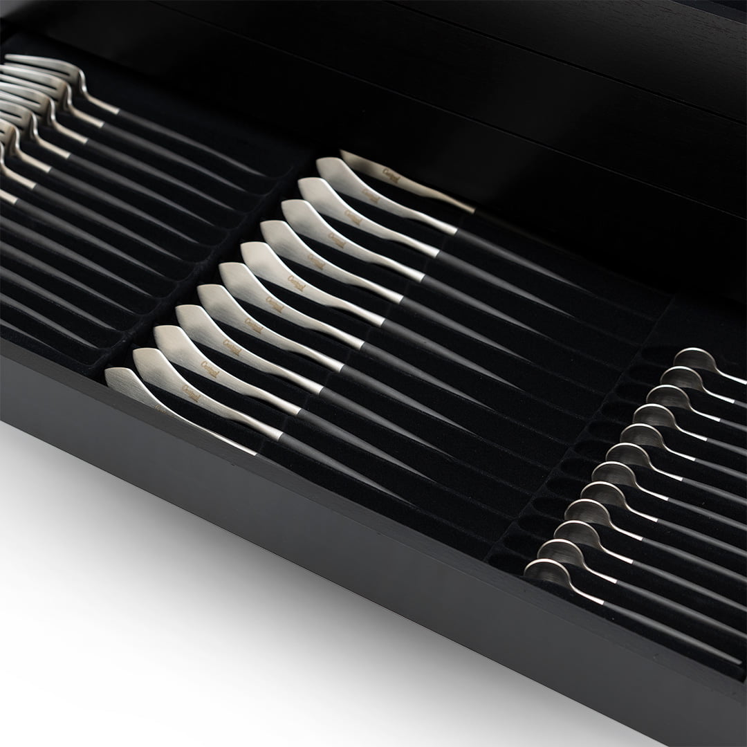 Presentatie/ opbergbox voor 130 delig bestek // Cutipol – Ja, dit is de officiële presentatie (opberg) box voor een 130-delig bestekset van Cutipol. Wat een prachtig eenvoudig en elegante box van hout met een strakke zwarte fineer finish. De buitenkant is een combinatie van zwart hout en duurzaam zwart fineer & binnen is deze gevoerd met fluweel.
