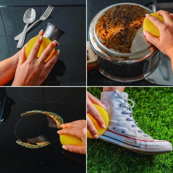 Glazen kookplaat, aangekoekte pannen, RVS, zilver, koper en messing, douchedeuren, tegels, BBQ-roosters, tuinmeubels, zwembad- en jacuzziranden, magnetron, fornuis, aluminium velgen, chroom en zelfs leer… hij laat alles weer stralen én legt een beschermlaagje achter zonder doffe plekken.