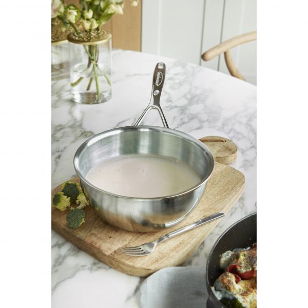 Een rijke nantuasaus maken op basis van rivierkreeftjes, voor bij die geweldige dorade? Of een smeuïge witte chocoladesaus voor bij je homemade gebak? Dan gebruik je best een conische sauteuse. En niet zomaar de eerste de beste. Ons doordachte en duurzame design doet precies wat het moet doen. Succes verzekerd bij complexe sauzen en tal van andere delicate bereidingen. De ronding van de Silver 7 conische sauteuse (18 cm) zorgt ervoor dat je vlot roert en moeiteloos extra luchtig opklopt. Dankzij het unieke 7-lagenmateriaal tot aan de rand bereid jij de perfecte hollandaise of een romige sabayon met een aanzienlijk kleinere kans tot schiften of aanbranden. De warmte wordt gelijkmatig gespreid en je hebt een perfecte controle over de temperatuur. Dat maakt deze topper uit ons assortiment trouwens ook bijzonder geschikt om aubergine, Chinese kool en andere groenten kort maar krachtig te sauteren. Tot de gewenste temperatuur komen vraagt een minimum aan energie, op eender welke kookplaat. Als je kookt op inductie levert de TriplInduc® technologie je zelfs tot 30% energiebesparing op. Nog een voordeel: dankzij de speciale gietrand giet je sauzen en vloeistoffen makkelijk over zonder morsen. De stijlvolle steel ligt goed in de hand. Afwassen is zo gebeurd. Door de ronding van de pot geraak je met je sponsje moeiteloos overal. Deze sauteuse kan ook probleemloos de vaatwasser in. De speciale Silvinox® technologie voorkomt verkleuring, behoudt de glans en zorgt ervoor dat je je sauteuse telkens moeiteloos schoon krijgt. De Silver 7 conische sauteuse is goed voor oneindig kookplezier en een lust voor het oog. Een echte aanwinst voor jouw keuken. Voor altijd.