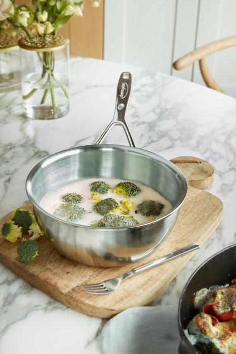 Een rijke nantuasaus maken op basis van rivierkreeftjes, voor bij die geweldige dorade? Of een smeuïge witte chocoladesaus voor bij je homemade gebak? Dan gebruik je best een conische sauteuse. En niet zomaar de eerste de beste. Ons doordachte en duurzame design doet precies wat het moet doen. Succes verzekerd bij complexe sauzen en tal van andere delicate bereidingen. De ronding van de Silver 7 conische sauteuse (20 cm) zorgt ervoor dat je vlot roert en moeiteloos extra luchtig opklopt. Dankzij het unieke 7-lagenmateriaal tot aan de rand bereid jij de perfecte hollandaise of een romige sabayon met een aanzienlijk kleinere kans tot schiften of aanbranden. De warmte wordt gelijkmatig gespreid en je hebt een perfecte controle over de temperatuur. Dat maakt deze topper uit ons assortiment trouwens ook bijzonder geschikt om aubergine, Chinese kool en andere groenten kort maar krachtig te sauteren. Tot de gewenste temperatuur komen vraagt een minimum aan energie, op eender welke kookplaat. Als je kookt op inductie levert de TriplInduc® technologie je zelfs tot 30% energiebesparing op. Nog een voordeel: dankzij de speciale gietrand giet je sauzen en vloeistoffen makkelijk over zonder morsen. De stijlvolle steel ligt goed in de hand. Afwassen is zo gebeurd. Door de ronding van de pot geraak je met je sponsje moeiteloos overal. Deze sauteuse kan ook probleemloos de vaatwasser in. De speciale Silvinox® technologie voorkomt verkleuring, behoudt de glans en zorgt ervoor dat je je sauteuse telkens moeiteloos schoon krijgt. De Silver 7 conische sauteuse is goed voor oneindig kookplezier en een lust voor het oog. Een echte aanwinst voor jouw keuken. Voor altijd.