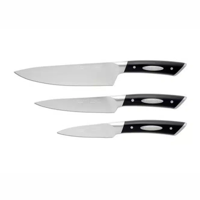 Deze messenset uit de Classic-collectie van het Deense kwaliteitsmerk Scanpan bestaat uit een koksmes, een vleesmes en een officemesje. Alle drie de messen hebben een ergonomisch handvat en zijn optimaal getemperd tot een hardheidsclassificatie van 56. Daarnaast beschikken ze over een uitstekende gewichtsverdeling en balans.