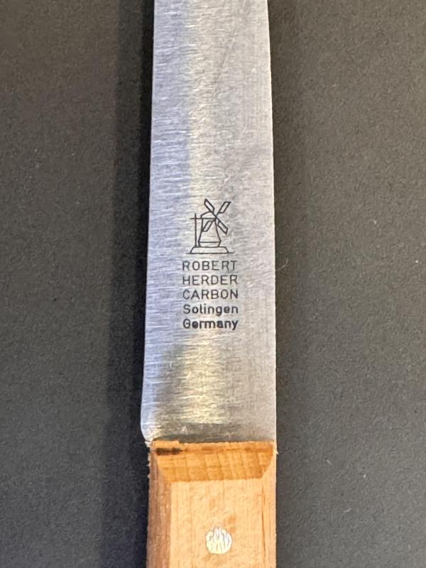 Het lemmet is gemaakt van koolstofstaal (carbonstaal). Dat betekent: het roest, maar het blijft vlijmscherp. Juist omdat het lemmet zo dun is geslepen volgens de traditionele Dünnschliff-techniek, snijdt het moeiteloos door groenten, fruit en aardappels. Even aanzetten op een slijpstaaf, en hij is weer als nieuw.