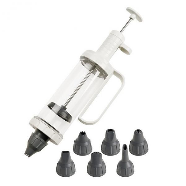 Deze garneerspuit van Dr. Oetker is handig voor het opspuiten van taartglazuur, soesjesdeeg, aardappelpuree, decoraties, garneringen en meer. De garneerspuit is gemaakt van transparant kunststof en 6 verschillende kunststof spuitmondjes zijn inclusief – deze zijn eenvoudig wisselen. Na gebruik mag de garneerspuit in de vaatwasmachine.