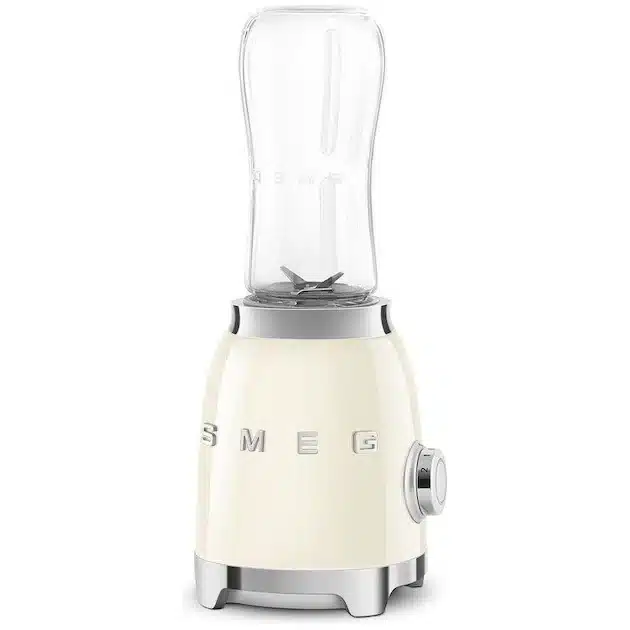 Met de Smeg personal blender heb je in een handomdraai je smoothie, milkshake, ice-coffee en andere dranken gemaakt. Met de bijgeleverde bekers en doppen kun je je drankje makkelijk meenemen om later op te drinken. Met zijn 300 watt is hij sterk genoeg om zelfs ijs te crushen. Hij heeft 2 snelheden waarmee je dit kan aanpassen aan het type drankje dat je wilt blenden. Kenmerkend is natuurlijk ook bij dit product het jaren 50 design die geheel in de lijn van alle andere Smeg apparaten ligt.