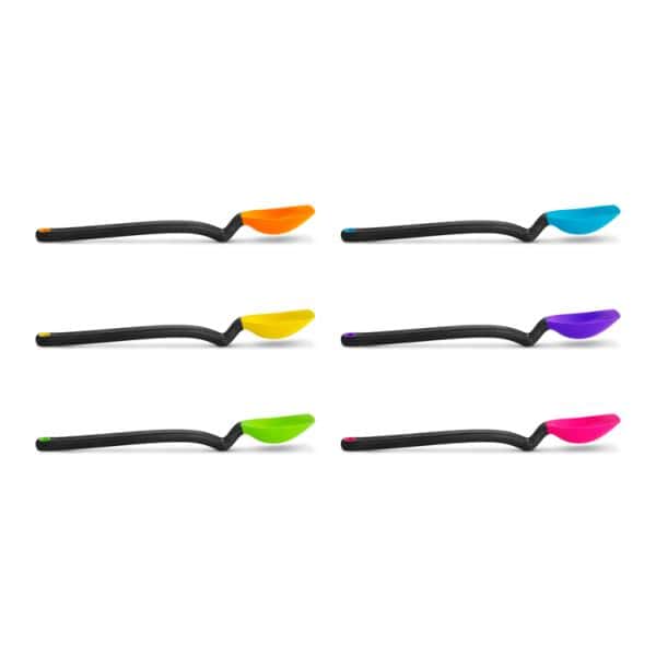 Deze kleine variant past in postjes, zo kan je de jam, mayonaise, pindakaaspot makkelijk leeg likken. Een moderne variant op de ouderwetse flessenlikker! Leverbaar in diverse frisse kleuren.