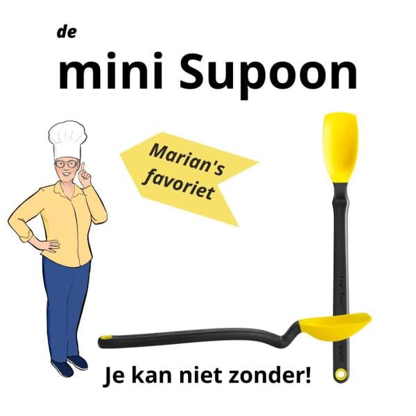 De slimste schraper is de Mini-Supoon van Dreamfarm. Dankzij de knik rust hij makkelijk op de rand van een potje of maakt hij het tafelblad niet vuil Hij is voorzien van een maataanduiding (5 ml, 1 tsp), dit maakt het gebruik van een maatlepel overbodig. Je kunt hem gebruiken om te roeren, te schrapen en op te scheppen.