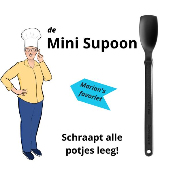 De slimste schraper is de Mini-Supoon van Dreamfarm. Dankzij de knik rust hij makkelijk op de rand van een potje of maakt hij het tafelblad niet vuil Hij is voorzien van een maataanduiding (5 ml, 1 tsp), dit maakt het gebruik van een maatlepel overbodig. Je kunt hem gebruiken om te roeren, te schrapen en op te scheppen.