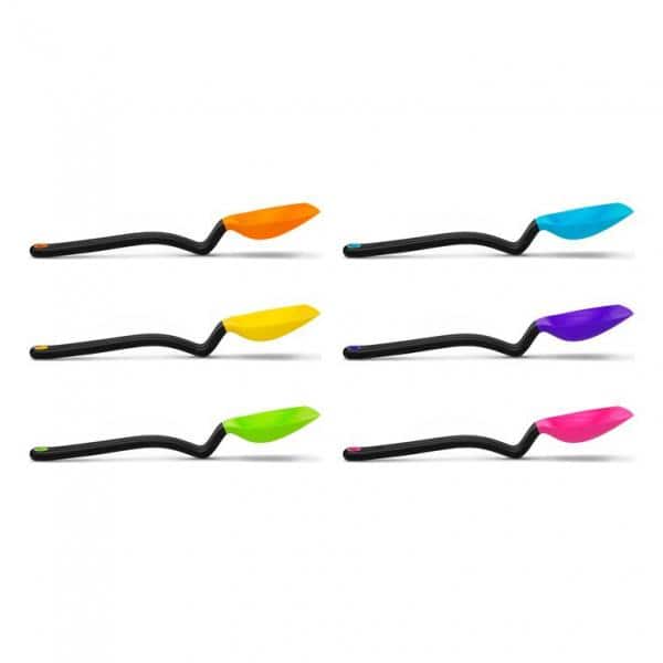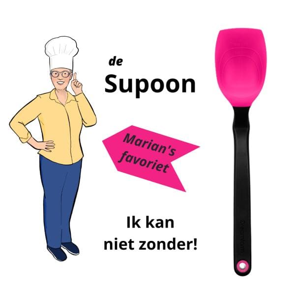 De slimste bakspatel is de Supoon van Dreamfarm. Dankzij de knik rust hij makkelijk op de rand van een koekenpan of maakt hij het aanrecht niet vuil Hij is voorzien van maataanduidingen (5 ml-1 tsp en 15ml-1 tbsp), dit maakt het gebruik van een maatlepel overbodig. Je kunt hem gebruiken om te roeren, te schrapen en op te scheppen.