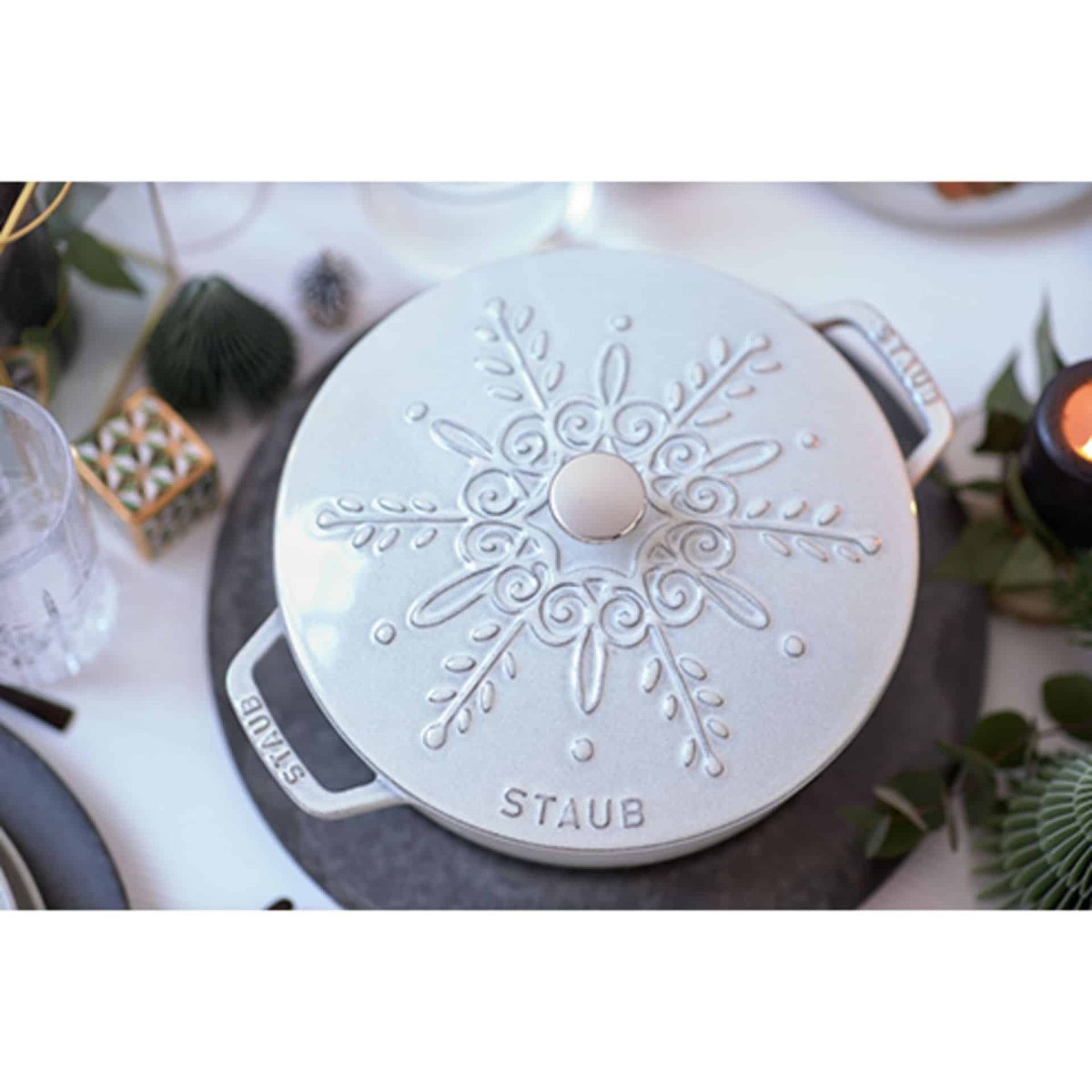 De Franse braadpan heeft dezelfde uitstekende kookeigenschappen als de Cocotte. Het geëmailleerde gietijzer verdeelt de warmte gelijkmatig voor de beste resultaten en houdt de temperatuur lang vast, zodat het eten de hele maaltijd warm blijft. De Chistera druppelstructuur creëert een Aroma Rain effect: verdampend vocht valt terug op het voedsel, waardoor vlees mals wordt en de smaak van de ingrediënten wordt versterkt. Wat deze Franse oven een zeer speciale toevoeging maakt aan elke goed ingerichte keuken en het perfecte cadeau voor fijnproevers, is de mogelijkheid om op het deksel te “tekenen”. Kies uit verschillende prachtige motieven, zoals de sneeuwvlok, op levendige kleuren. Het prachtige ontwerp laat de Franse oven echt opvallen en voegt een interessant tintje toe aan de tafel wanneer hij wordt gebruikt om te serveren. Met zijn conische vorm en de afgeronde hoeken is de Franse oven ideaal voor alle gerechten die vaak geroerd worden, zodat de kooklepel elke hoek kan bereiken. Probeer het eens met recepten zoals “groentepilaf met saffraan en kipfilet” of een romige risotto. De Franse oven is geschikt voor alle soorten kookplaten en kan ook in de oven worden gebruikt, bijvoorbeeld om brood in een perfecte ronde vorm te bakken. 24 cm diameter, rond, White Truffle Art edition gewelfd deksel met sneeuwvlokpatroon Geëmailleerd gietijzer voor hoge duurzaamheid Roestvrijstalen knop Geschikt voor alle soorten kookplaten, inclusief inductie en in de oven