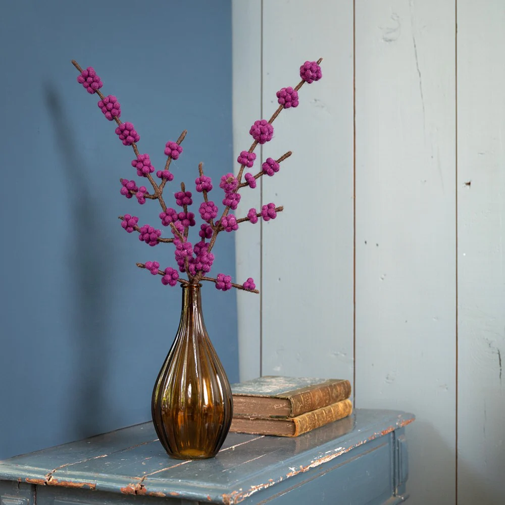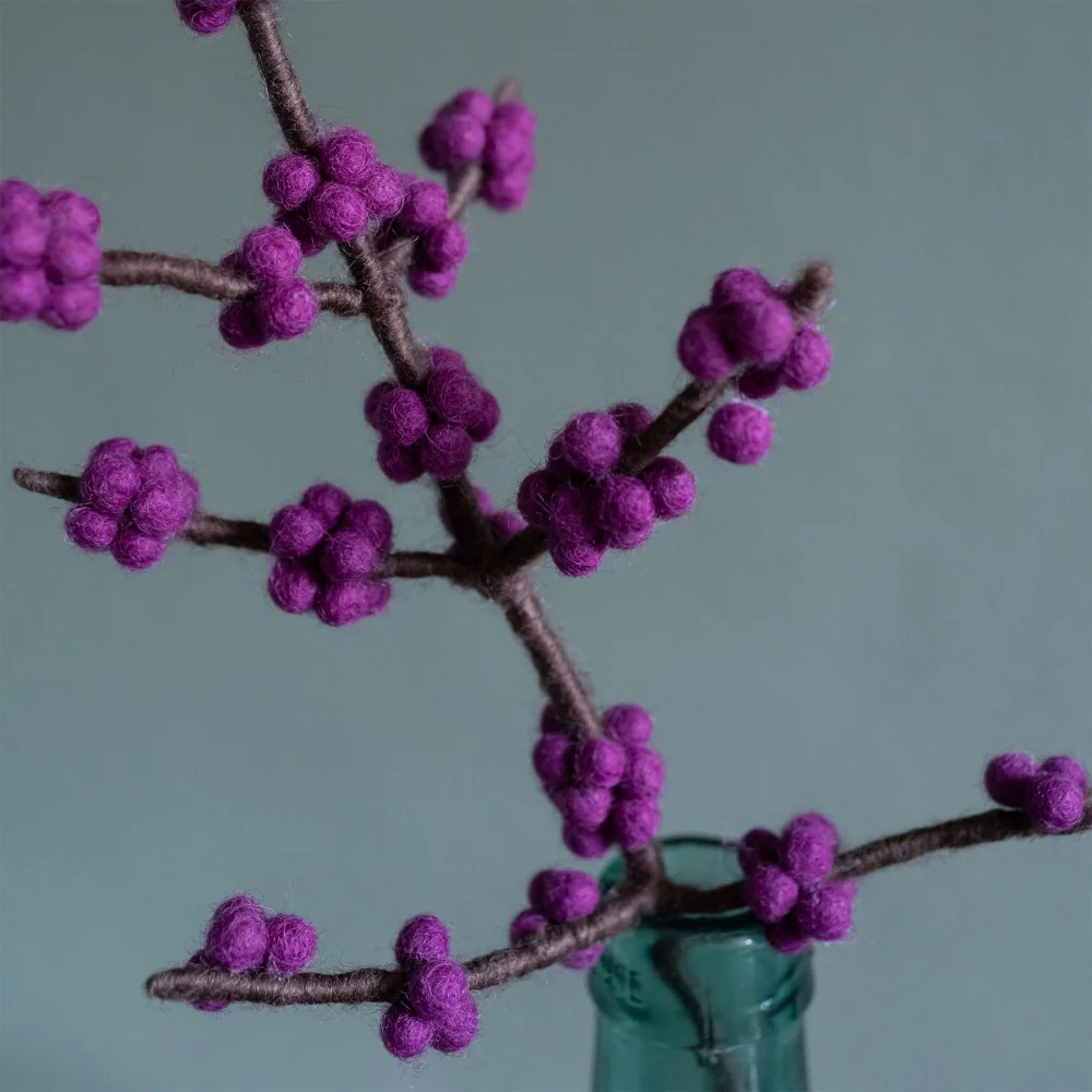 Tak bes Calicarpa in de kleur paars gemaakt van vilt. In de stengel is metaaldraad verwerkt zodat de tak in vorm gebogen kan worden indien gewenst. Erg leuk in een vaas!