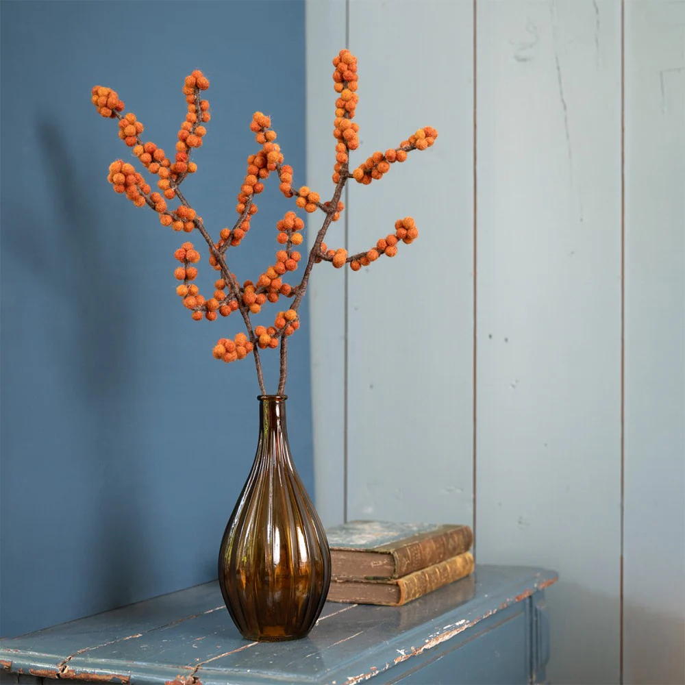 Tak bes Ilex in de kleur oranje gemaakt van vilt. In de stengel is metaaldraad verwerkt zodat de tak in vorm gebogen kan worden indien gewenst. Erg leuk in een vaas!