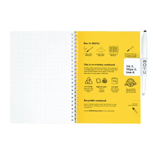 De (Frixion) inkt van de bijgeleverde MOYU pen droogt volledig op het papier, en kan ook weer vlekkeloos uitgewist worden middels een vochtig doekje. Je kunt de pagina’s vervolgens tot wel 500 keer herschrijven.