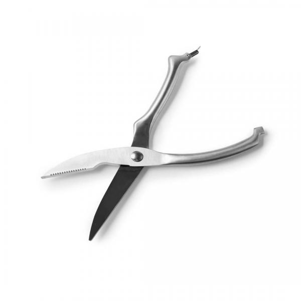 Deze professionele gevogelteschaar van Ibili is handig voor het knippen van vlees en kleine botjes van allerlei soorten gevogelte (kip, eend, kalkoen enz.). De schaar is gemaakt van roestvrij staal en voorzien van lichte kartels zodat je een stevige grip hebt tijdens het knippen. Na gebruikt houdt een slotje de schaar dicht voor veilig en compact opbergen. De gevogelteschaar is vaatwasmachinbestendig.