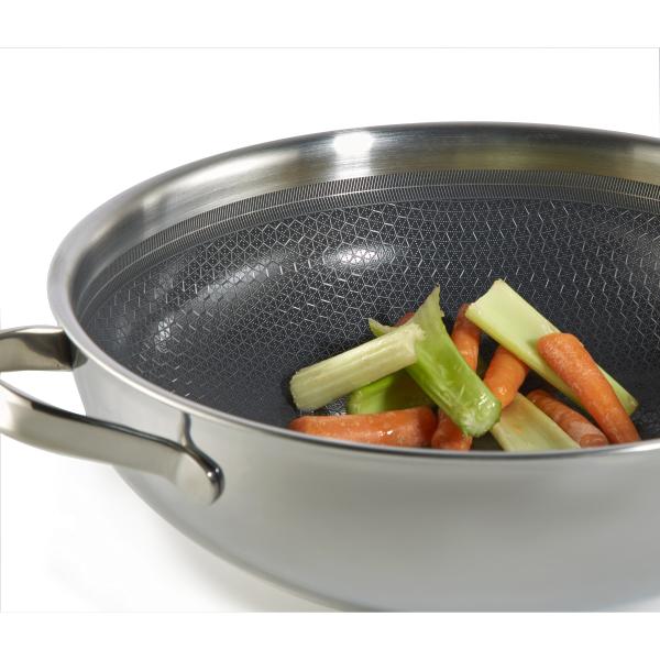 De Habonne Hybrid wok is ideaal voor iedereen die houdt van gezond en snel koken. Roerbakgerechten, knapperige groenten of stukjes vlees krijgen door de hoge hitte en de perfecte warmteverdeling die typische wokstructuur: kort gebakken, vol smaak en met behoud van bite. Dankzij de Triply constructie (RVS – aluminium – RVS) verspreidt de warmte zich niet alleen over de bodem, maar ook langs de hoge zijkanten van de pan. Zo bereid je alles gelijkmatig, zelfs als je ingrediënten constant in beweging houdt.
