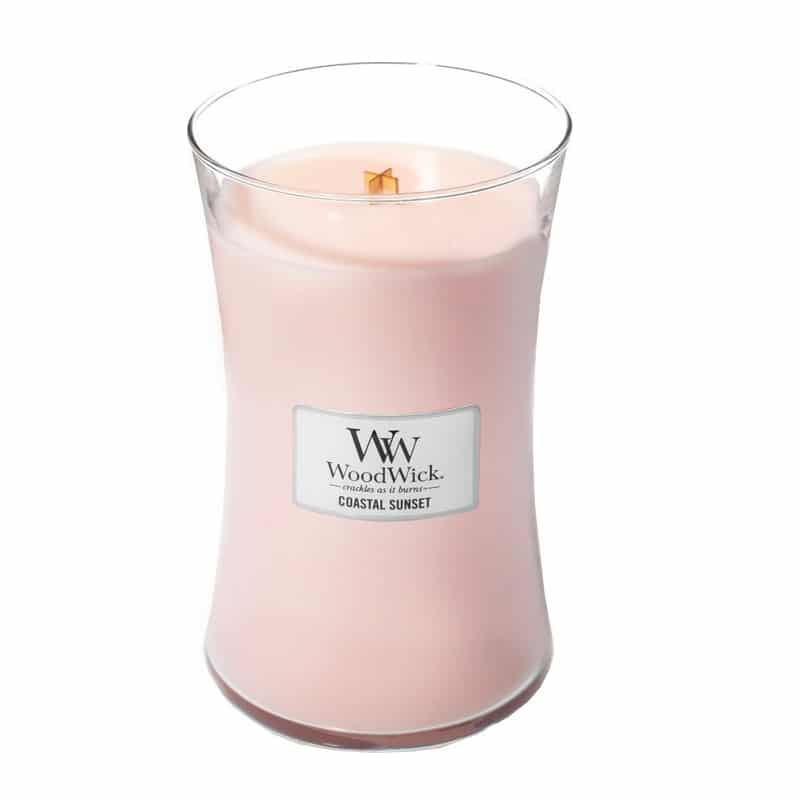 Woodwick Large Candle Coastal Sunset : De geur Coastal Sunset is de heerlijke geur van zonovergoten bloesems met een uitnodigende geur van kokos en zilte zeelucht, deze geuren nemen je mee naar de geur van de kust.