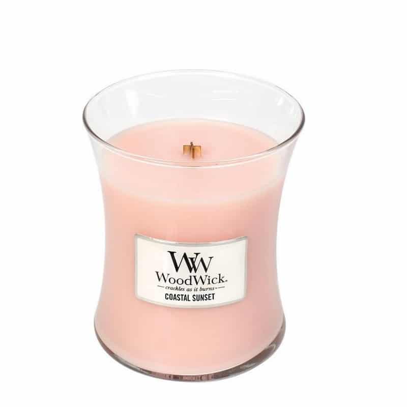 Woodwick Medium Candle Coastal Sunset : De geur Coastal Sunset is de heerlijke geur van zonovergoten bloesems met een uitnodigende geur van kokos en zilte zeelucht, deze geuren nemen je mee naar de geur van de kust.