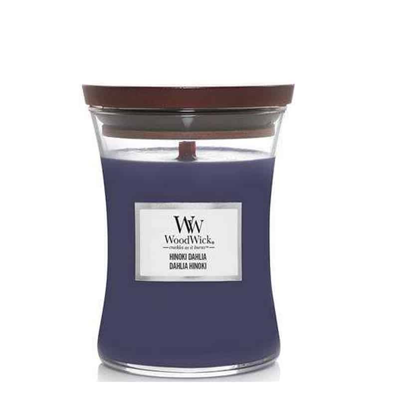Woodwick Medium Candle Hinoki Dahlia : Woodwick Hinoki Dahlia is een meer dan prima geur creatie met de geur van overheerlijke in de bloei staande dahlia’s in combinatie met de zacht warme geur van Hinoki hout.