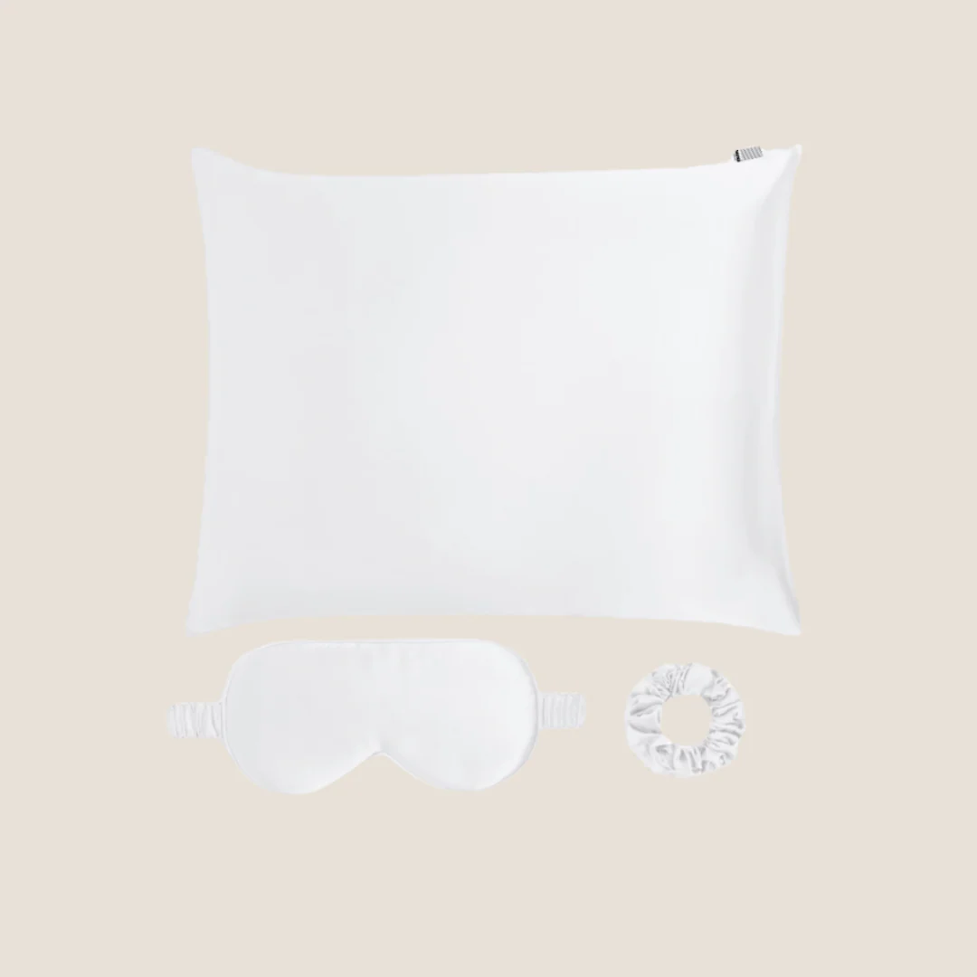 Zacht, koel en rimpelloos. Deze zijden set slaapaccessoires strijkt iedere nacht glad. Een luxe cadeau aan jezelf dat thuishoort in iedere slaapkamer. Het bestaat uit een kussensloop, oogmasker en scrunchie van premium 23 momme moerbei zijde. Een vrij rijk type zijde dat je nachtrust op verschillende manieren een upgrade geeft. Ontdek de voordelen voor je huid, haar en slaap.