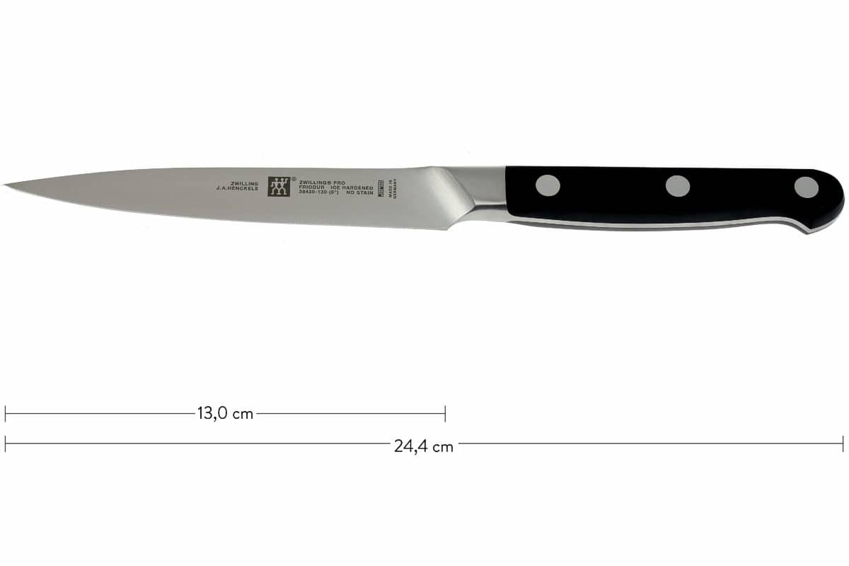 Het lemmet is gemaakt van ijsgehard Friodur-staal. Tijdens deze behandeling wordt het staal in 4 stadia verhit tot 1000ºC en gekoeld tot -70ºC. Deze door Zwilling geperfectioneerde techniek staat ervoor garant dat scherpte, duurzaamheid, elasticiteit en roestbestendigheid optimaal zijn. Ook het slijpen van het mes gaat in 5 stappen. Het resultaat is een volmaakt geslepen mes. De krop van het mes loopt niet door tot de snede van het lemmet zodat het goed op een slijpsteen geslepen kan worden.