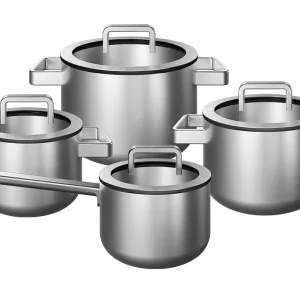 De set bestaat uit steelpan 16cm, kookpan 16,18,20cm en soeppan 24cm